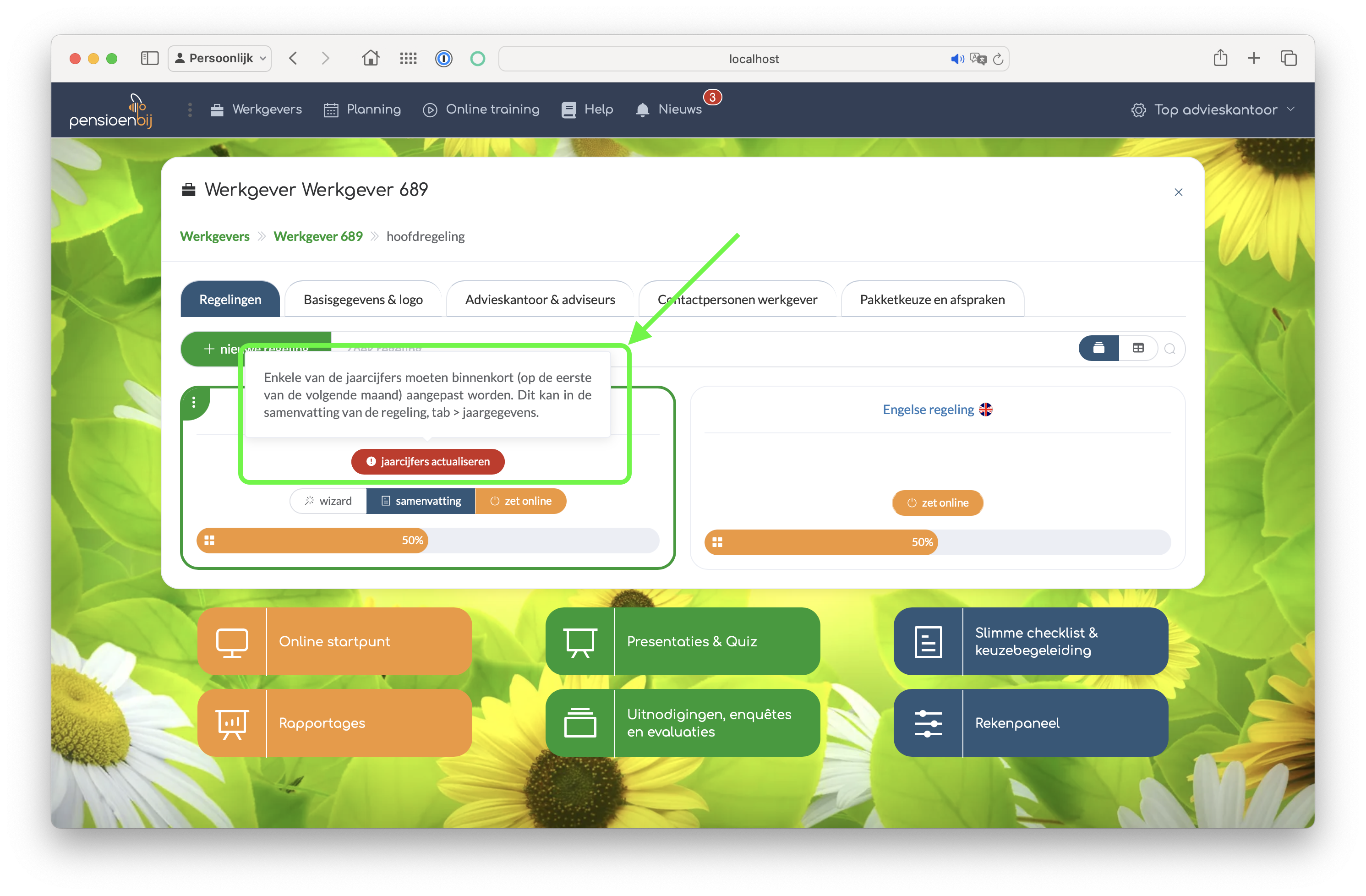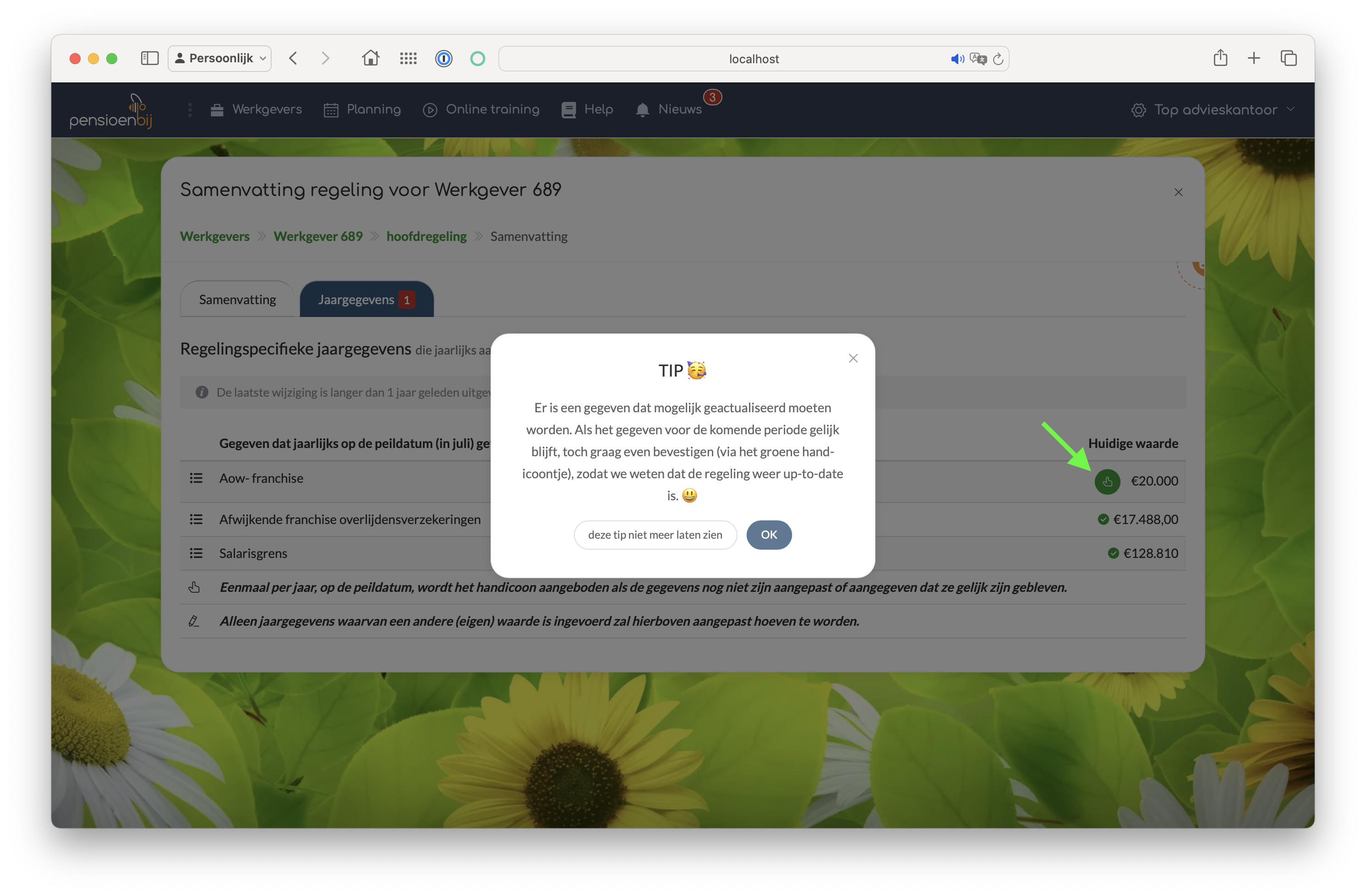 De link brengt de adviseur naar de betreffende werkgever en regeling. In de kaart wordt zichtbaar gemaakt dat er sprake is van bedragen die mogelijk geactualiseerd moeten worden. Dit omdat er een andere waarde is ingevuld.